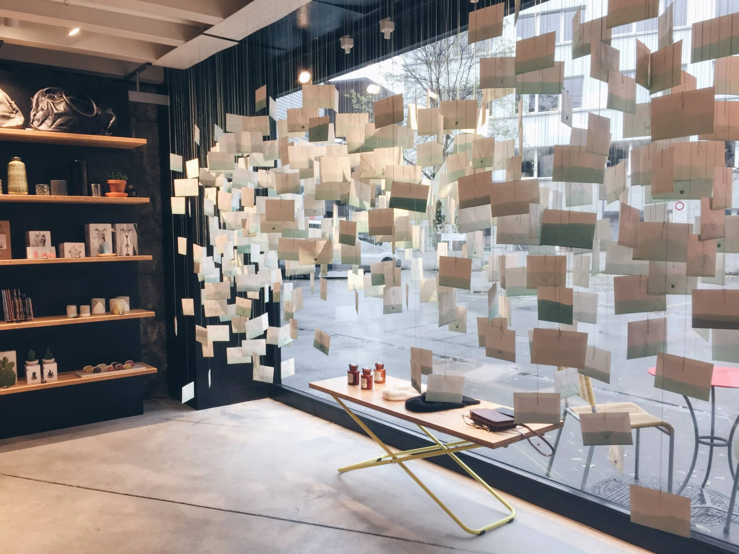 The installation "Collected Stories” offers a poetical experience during the christmas season. Christmas is often a time of mixed feelings, for some it is a time of happiness and joy, for others stress, fights or just loneliness. The collection shares the thoughts, stories, or experiences of people from different cultures on this subject. The hanging envelopes are to take home.